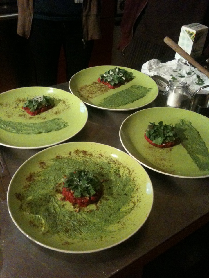The dish came together in such a beautiful way that you understood immediately how it would be a crowd pleaser. It made us all stand in awe at the idea of Noma and the possibility of cooking in that kitchen. Once we had made the tartar the real way we all took a moment to plate our own dish. Mine was the more free-spirited one …can you tell? What can I say, I was feeling swirly that night.