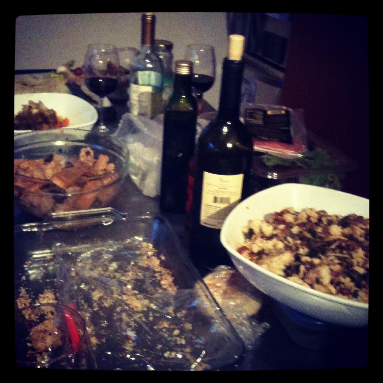 While it is usually a random hodge podge of a meal, there are a few ingredients that are always a must…bacon, cheese, and wine. We always start our menu planning by identifying the ingredients that need to go. Tonight it was a loaf of stale bread, some left over pasta, some left over roasted vegetables and radishes. So what did we create, salad, a vegetable pasta, and bourbon chocolate bread pudding!
