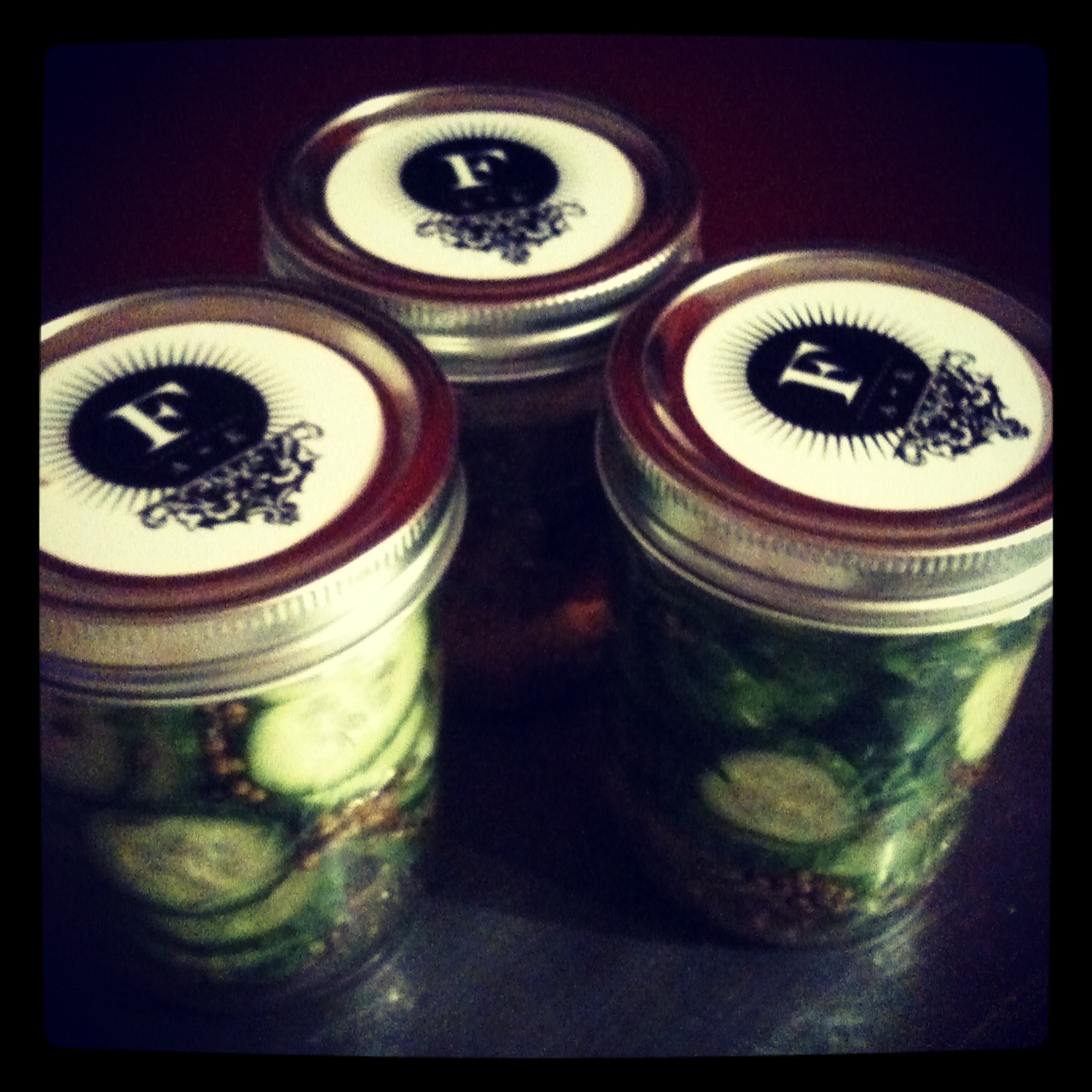 Slice cucumbers thin, 1/4 inch. In the bottom of a clean jar add the coriander seeds, mustard seeds, crushed bay leaves, and fennel seed. Put the sliced cucumbers on top. In a separate container, mix sugar, salt, really hot water, and rice wine vinegar. Once combined, pour over the cucumbers and seal jar. They are good in an hour but best after about 48 hours.