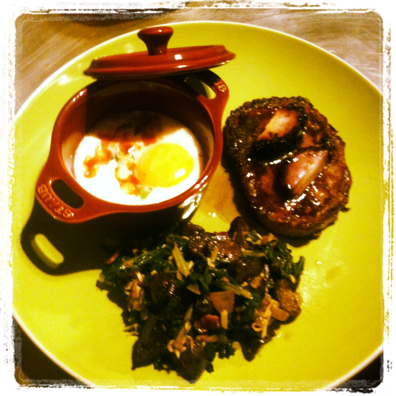 Coddled eggs with creme fraiche, scallions and hot sauce