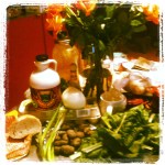 Stale bread, purple potatoes, goat cheese log covered with blueberries, chard (from the garden…woo hoo), and creme fraiche