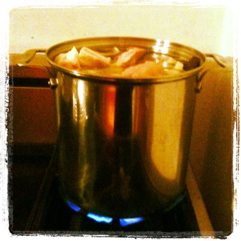If making brown stock roast the bones at 400 degrees for about 20 minutes for chicken or 40 for pork or beef.  Heat oil in pot and add vegetables. Saute until translucent, add the bones into the pot and cover with water. Bring to a simmer and periodically skim the top of any impurities. Let simmer all night! Once it has reduced, strain the stock and discard the bones and vegetables. Place in jars and let cool.  Keep the tops off the jars until they have cooled to ensure they do not seal. Once cool, skim the fat off of the stock and store until use.