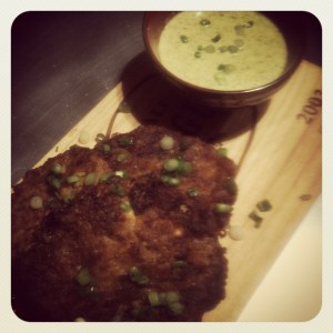 Once you have your “batter” ready. Heat oil (I like grapeseed or canola when frying but it is up to you) in a large skillet. You will not be submerging the fritter you will be just partially frying them so add oil accordingly. Make your fritters into patties, diameter is up to you but try to keep them at about 1/2 inch thick. Dust them on both sides in flour, this will add a nice crunch to the outside of your fritter. Gently place them in the hot oil and brown on both sides. 2-3 minutes on each side should suffice. They cook pretty quickly. Remove from heat and serve immediately. Highly recommend a dipping sauce of some sort. We made a curry and tarragon aioli with the rice fritters.