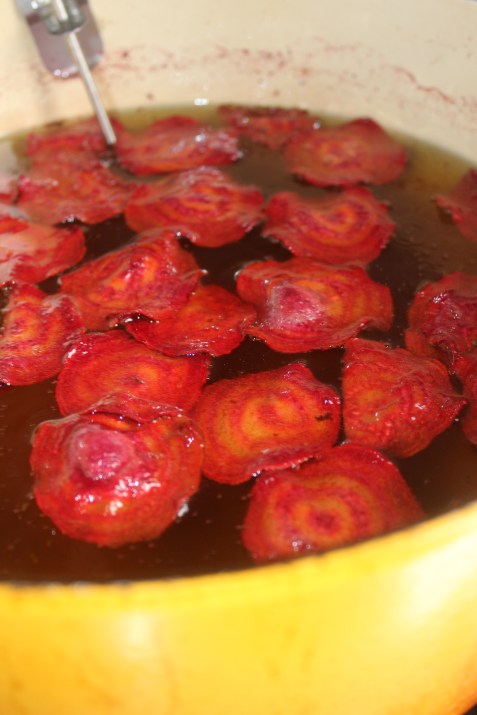 Fry the potatoes first then the beets (the beets turn the oil red). You will fry the potatoes and beets for about 1-2 minutes per batch. Keep an eye on your temperature as it will lower when you add the slices. When you first place the slices in the oil you will see aggressive bubbles, when the bubbles start to subside that is when you pull them. Be careful not to burn them. Place on paper towel to cool.
