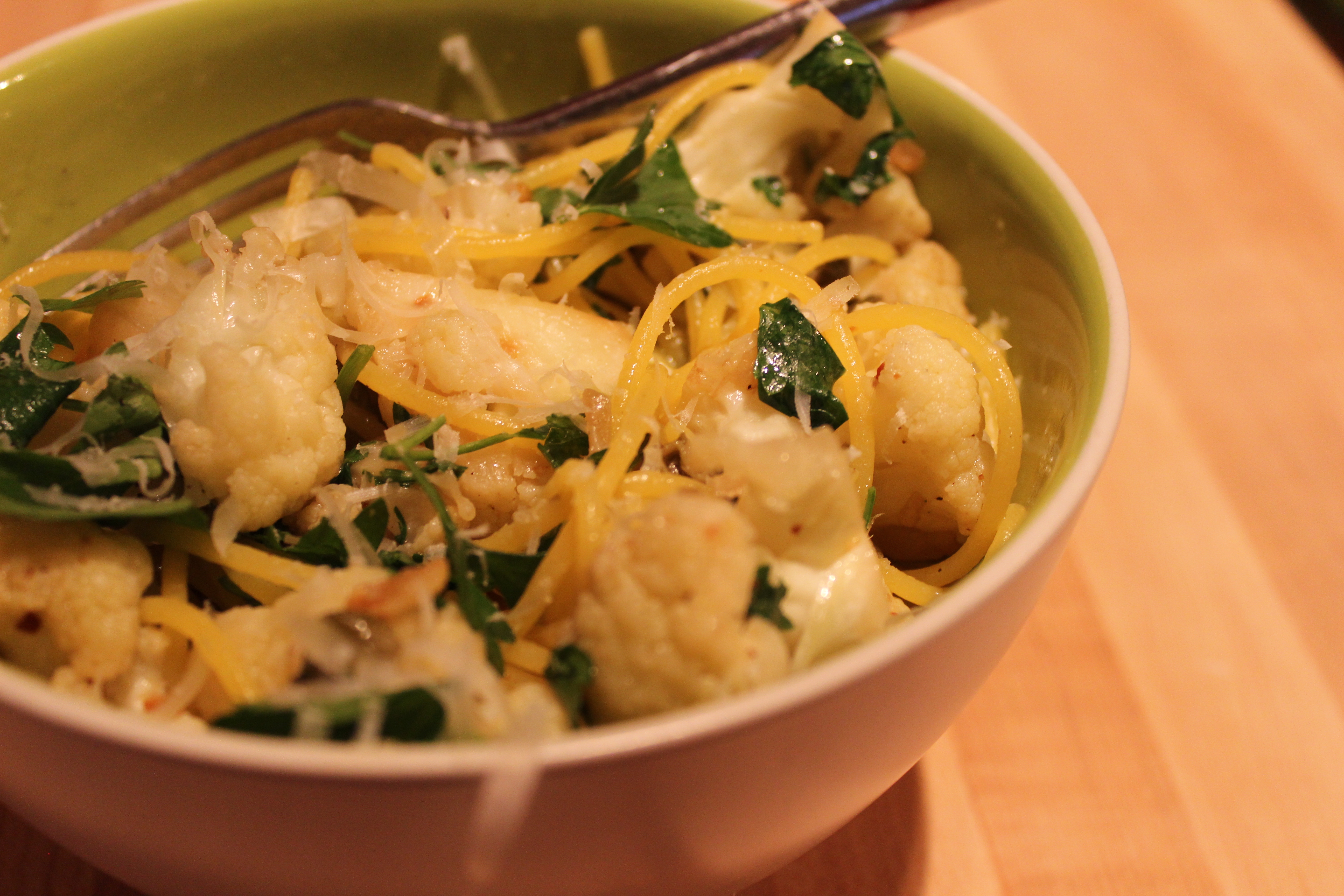 I have no idea where this recipe came from but it is one of my favorites. It is fresh, healthy, and full of flavor. I typically use gluten-free quinoa pasta with this. The texture of quinoa pasta stands up to the cauliflower and adds a nice nutty quality to the dish. Of course you can use regular spaghetti or a whole wheat spaghetti. For the sake of time I typically saute the cauliflower but if you have the time, you can also roast the cauliflower at 400 for 30 minute or until tender in the middle, then add to the dish with capers. The roasted flavor will add another level of complexity, plus the color of roasted cauliflower is beautiful in this dish.