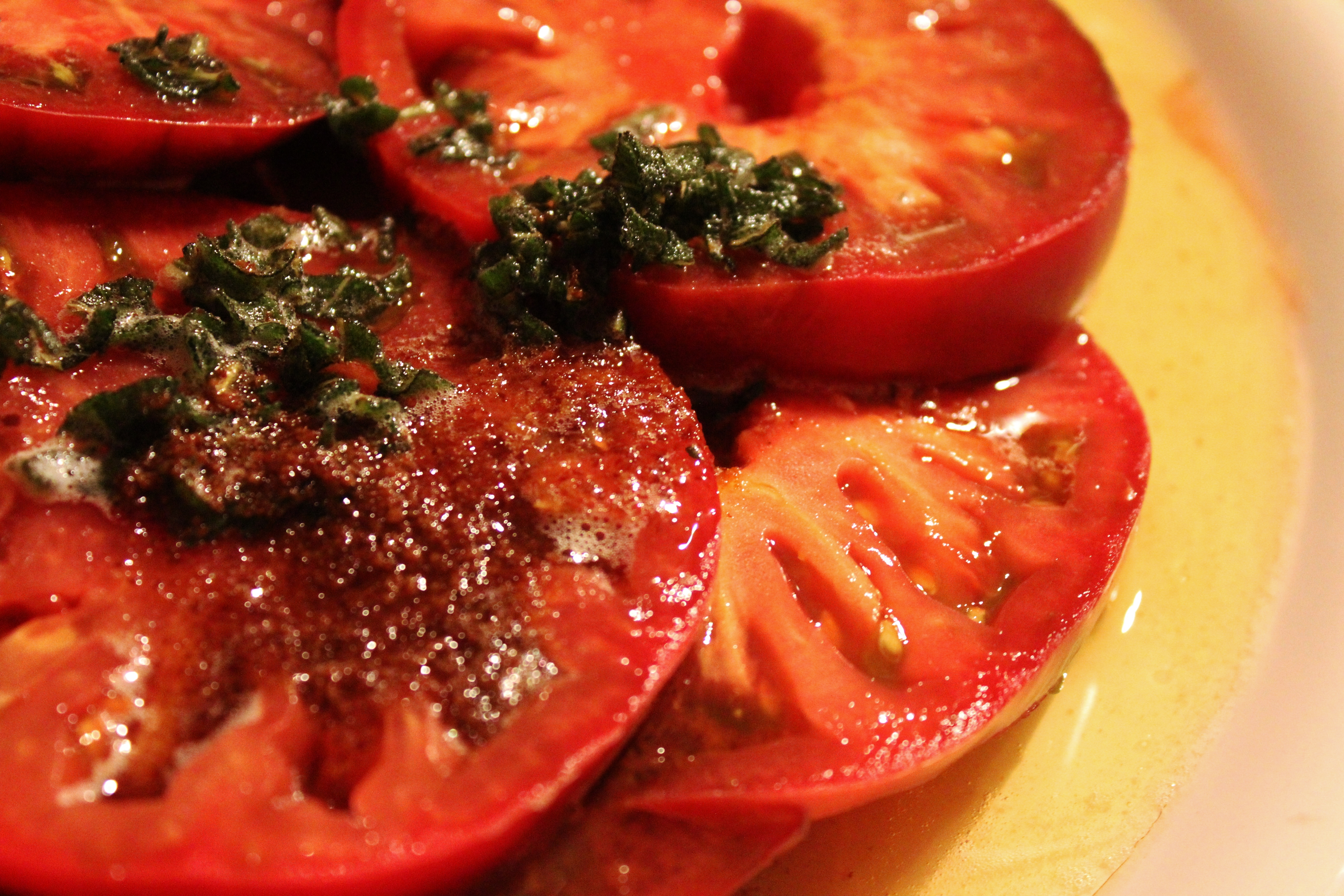 Drizzle over the sliced tomatoes. Season with salt and pepper and eat right away. Don’t forget to scarpetta
