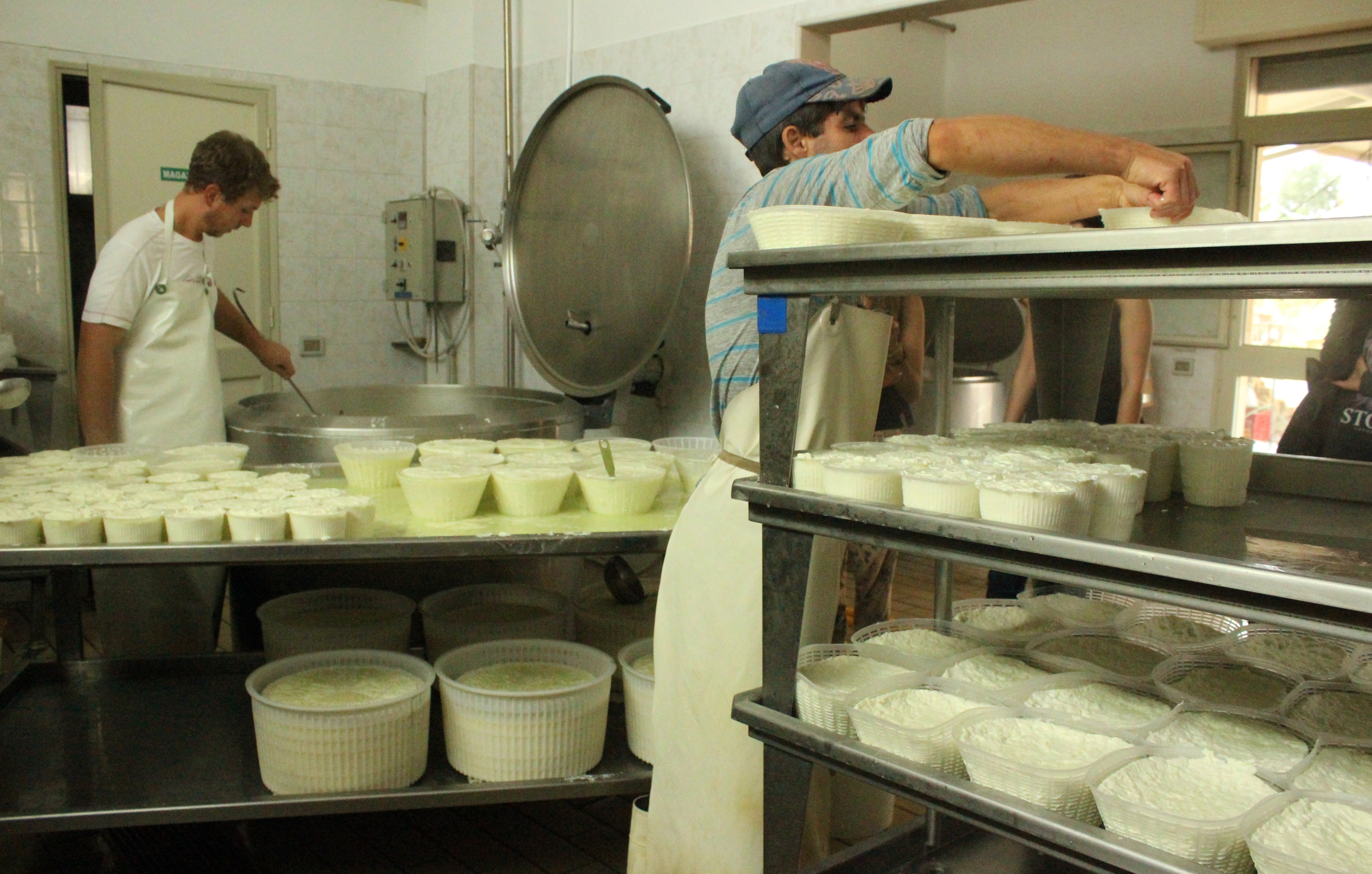 Ricotta is the ultimate leftover recipe, created out of necessity not out of love. Instead of throwing away the leftover whey from cheese production, you “recook” it, making ricotta. The whey is allowed to sit for 12-24 hours in a large stainless steel vat to intensify in acidity. A small amount of salt is added and then it is heated to nearly boiling. Small white curds start to form as the liquid increases in temperature. Gently the Cucchiara family stirs the vat, careful not to disturb the precious curds. There are no thermometers at this point, there is just instinct. When they are satisfied they start to move it into the plastic containers waiting patiently in front of the vat.